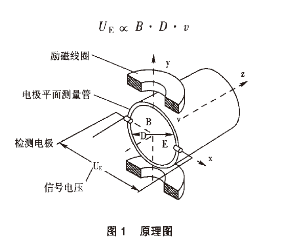 產(chǎn)生與流量成比例的感應(yīng)電勢(shì),流體中產(chǎn)生的感應(yīng)電動(dòng)勢(shì)被位于管子徑向兩端的一對(duì)電極拾取,該信號(hào)電壓uE與磁場強(qiáng)度B、電極間距離D和平均流速穢成正比。磁場強(qiáng)度B和電極距離D是常數(shù),所以信號(hào)電壓與平均流速口成正比。計(jì)算公式如下: