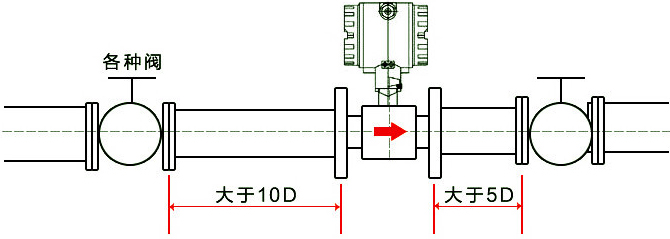 1、對直管段的要求:必須水平安裝在管道上(管道傾斜在5以內(nèi)),安裝時流量計軸線應(yīng)與管道軸線同心,流向要一致。上游管道長度應(yīng)有不小于2D的等徑直管段,如果安裝場所充許建議上游直管段為20D、下游為5D。