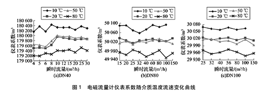 由圖1可得:( 1)隨著介質(zhì)溫度的升高,管道污水處理進(jìn)出水口流量計(jì)的儀表系數(shù)均呈逐漸降低的趨勢(shì)。其中20℃和50℃的儀表系數(shù)基本相同,10℃和80 0C的儀表系數(shù)與20℃時(shí)偏離較大。(2)溫度對(duì)管道污水處理進(jìn)出水口流量計(jì)的儀表系數(shù)在高溫以及低溫處影響明顯,以D N40管道污水處理進(jìn)出水口流量計(jì)為例,儀表系數(shù)本次實(shí)驗(yàn)高低溫處*大變化量約為0. 7% o ( 3)在管道污水處理進(jìn)出水口流量計(jì)相應(yīng)的流量范圍內(nèi),在同一溫度下,隨著介質(zhì)流速的變化,管道污水處理進(jìn)出水口流量計(jì)的儀表系數(shù)在個(gè)別點(diǎn)出現(xiàn)略微浮動(dòng),但整體變化不超過1 0. 2 %。