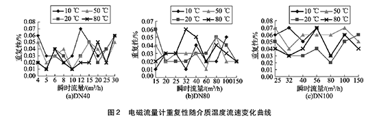 將實(shí)驗(yàn)測(cè)得的管道污水處理進(jìn)出水口流量計(jì)在不同溫度及流速下的重復(fù)性數(shù)據(jù)整理,特性曲線如圖2所示,3組曲線分別對(duì)應(yīng)DN40, DN80, DN100的3塊管道污水處理進(jìn)出水口流量計(jì)的重復(fù)性曲線。