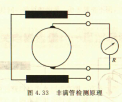 非滿管檢測也是基于電導(dǎo)率檢側(cè)的方法。在圖4.33所示的電磁流量傳感器中,增加了一個(gè)(或一對)非滿管檢測電極。當(dāng)導(dǎo)管內(nèi)液體滿管時(shí),頂部電極與其他電極之間的電阻值很小;而當(dāng)存在非滿管情況時(shí),頂部電極與導(dǎo)電液體之間有氣體阻隔,所以電極電阻顯著增大,從而做出非滿管判斷。