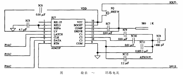 HT2012需要外部提供460.8kHz的時鐘信號,且要求時鐘頻率的誤差是0.1%,若直接入一個460.8kHz的晶振不僅會引起系統(tǒng)功耗的增加,而且該晶振屬于非標(biāo)準晶振,需專門定制。為了解決這一問題,在系統(tǒng)中采用一片1.8432MHz的晶振以產(chǎn)生時鐘信號,再經(jīng)分頻器CD4013進行4分頗,可輸出1.8432MHz/4=460.8kHz的分頻信號供HT2012使用。AD421其內(nèi)部的電壓調(diào)節(jié)器與外部的場效應(yīng)管DN25D對輸入到AD421的電壓進行調(diào)整,可提供+3.3V電壓作為其他設(shè)備的電源。HART發(fā)出的FSK信號,經(jīng)過一個電容耦合送到AD421中,轉(zhuǎn)換成相應(yīng)的0.5mA正弦電流信號,實現(xiàn)電壓信號到電流信號的轉(zhuǎn)換,同時,疊加在4~20mA的電流上送給接收設(shè)備,實現(xiàn)了HART協(xié)議的信息的交換。本電路耦合電容取為0.0033μF,如圖5所示。