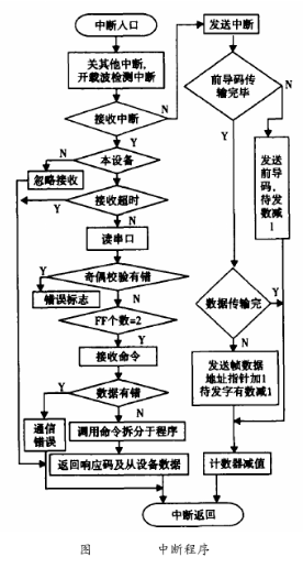 在HART通信中,雨水流量計作為從設(shè)備進行通訊,所以這里的軟件設(shè)計只是針對于從設(shè)備。HART通信采用水平和垂直校驗的方法。當(dāng)檢測到接收數(shù)據(jù)有差錯時,則等到主設(shè)備命令幀發(fā)完后,通知主設(shè)備數(shù)據(jù)接收有誤。主設(shè)備則重新發(fā)命令幀,從而保證通信的準確可靠。HART中斷子程序流程圖如圖6所示。由于HART通信為主從方式,HART幀中每個字節(jié)在物理層傳輸需要9ms左右,為了保證通訊的實時性,通訊程序采用串行口終端接收/發(fā)送。該中斷所要完成通信中的主要任務(wù),即接收和發(fā)送幀,幀的拆分和打包。