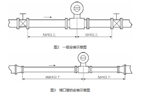硝酸管道流量計(jì)的安裝質(zhì)量對(duì)其測(cè)量結(jié)果的影響較大,因此在安裝時(shí)需要注意幾個(gè)問(wèn)題。*先,硝酸管道流量計(jì)直管段的選擇在配管時(shí)一定要按照要求進(jìn)行選擇,一般選擇流量計(jì)通徑與工藝管道通徑相同,即可滿足工程需要,而且安裝方便、壓力損失小,流量計(jì)直管段上游側(cè)的長(zhǎng)度不少于5倍工藝管道直徑,下游側(cè)的長(zhǎng)度不少于3倍工藝管道直徑(圖2)。但在流速太慢而又要求精度較高或需要變徑的應(yīng)用場(chǎng)合,可選擇通徑小于工藝管道通徑的流量計(jì),以提高測(cè)量精度,此時(shí)流量計(jì)上、下游必須加裝異徑管,且進(jìn)口異徑管上游側(cè)應(yīng)有長(zhǎng)于10倍工藝管道直徑的直管段,下游側(cè)應(yīng)有長(zhǎng)于5倍工藝管道直徑的直管段(圖3)。
