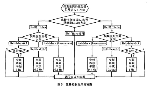 實(shí)際生產(chǎn)中流量一直在某個(gè)區(qū)域內(nèi)波動(dòng),且其動(dòng)態(tài)特性不易掌握。從上面的理論中我們能夠讓誤差△£盡可能的小,這樣距我們所需要的理論值%就越接近。而減小誤差需要我們把n取的盡可能大,也就是在生產(chǎn)時(shí)間內(nèi)劃分更多的周期去調(diào)節(jié)流量。當(dāng)工控機(jī)根據(jù)測濃硫酸流量計(jì)傳送回來的信號發(fā)出調(diào)節(jié)變頻器工作頻率的指令后,電機(jī)調(diào)整功率到測濃硫酸流量計(jì)的實(shí)際測量為一個(gè)工作周期,我們知道從指令發(fā)送到實(shí)際測量值返回有一個(gè)較大的滯后,如果調(diào)節(jié)的周期時(shí)間小于流量計(jì)本身的一個(gè)工作周期,那么顯然不可能達(dá)到減小誤差的目的。利用模糊控制思想H。,在控制程序中我們把流量的波動(dòng)區(qū)域劃分為±缸×Yo,Yo-t-O.3,Yo±0.5四個(gè)區(qū)域,其中缸為可調(diào)節(jié)的誤差范圍,生產(chǎn)中我們?nèi)?.015,流量區(qū)域劃分的單位均為t/h。針對不同的區(qū)域采取不同的調(diào)整方案。具體流程如圖3所示。圖中變量Rel表示實(shí)際測量的流量,變量Idea表示理論流量。