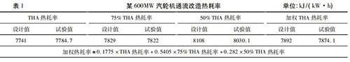 隨著火電機(jī)組利用小時(shí)數(shù)降低,發(fā)電企業(yè)一般都會根據(jù)不同負(fù)荷工況下的實(shí)際運(yùn)行小時(shí)數(shù),確定機(jī)組熱耗率考核權(quán)重,形成*終的加權(quán)熱耗率考核值??己思訖?quán)熱耗率對設(shè)備廠家末級葉片選型、高壓調(diào)門與高壓缸匹配性提出了更高的要求,在當(dāng)前負(fù)荷率偏低的情況下增強(qiáng)了發(fā)電企業(yè)的競爭力。然而,僅僅對加權(quán)熱耗率進(jìn)行考核是不夠的,設(shè)備廠家為了增強(qiáng)自身的競爭力,往往會把全部重點(diǎn)放在如何降低占比大的低負(fù)荷熱耗率上而犧牲高負(fù)荷的熱耗率,這無疑削弱了發(fā)電企業(yè)的適應(yīng)性。某廠一臺 600MW 汽輪機(jī)通流改造時(shí)僅對加權(quán)熱耗率進(jìn)行考核,THA 熱耗率要高出設(shè)計(jì)值43. 7 kJ/( kW·h) ,詳見表 1。通流改造時(shí)既要對加權(quán)熱耗率進(jìn)行考核,也要對 THA工況時(shí)熱耗率進(jìn)行考核。