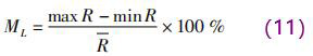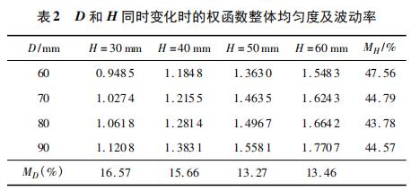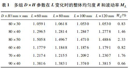 計(jì)算多組相同 D × H、不同 L 時 xy 平面的權(quán)函數(shù)整體均勻度 R 及波動率 ML,如表 1 所示。