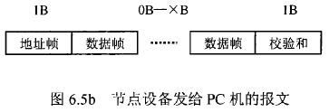 在花生油流量計等節(jié)點設(shè)備和C機通信的過程中,由地址幀、命令幀、數(shù)據(jù)幀、校驗和可組成各種功能不同的報文。由于采用主從工作方式來實現(xiàn)通信,花生油流量計等節(jié)點設(shè)備僅能接收并執(zhí)行PC機發(fā)送來的控制命令,而不能發(fā)送命令給PC機。因此,由PC機發(fā)往流量計等節(jié)點設(shè)備的報文一般包括一個地址幀,一個命令幀,若干個數(shù)據(jù)幀和一個校驗和,其報文格式圖.6a5所示;而由流量計等節(jié)點設(shè)備發(fā)往PC機的報文一般包括一個地址幀,若干個數(shù)據(jù)幀和一個校驗和,其報文格式如圖6.5b所示。