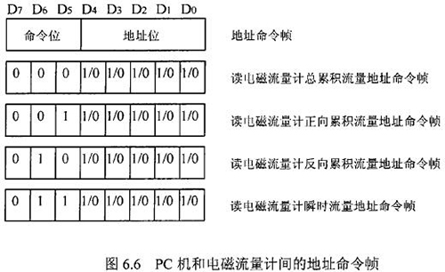 由于RS一485電氣標(biāo)準(zhǔn)規(guī)定每段只能聯(lián)結(jié)犯個節(jié)點設(shè)備,因此可用地址幀中五個二進制位表示這32個地址,其余3位用來表示命令,從而構(gòu)成地址命令幀。對于控制命令需求不超過八個的通信系統(tǒng),采用地址命令幀可壓縮報文長度提高通信效率。在污水網(wǎng)絡(luò)監(jiān)控系統(tǒng)中,花生油流量計和PC機通信的主要目的是將流量計中的有用數(shù)據(jù)讀到PC機中。這些數(shù)據(jù)包括:總累積流量、正向累積流量、反向累積流量、瞬時流量。通信時,PC機只需向花生油流量計發(fā)送讀總累積流量、讀正向累積流量、讀反向累積流量、讀瞬時流量命令即可,因此二者間通信所用的地址幀和命令幀可合二為一,用一個地址命令幀代替。PC機和花生油流量計間的地址命令幀定義如圖.66所示。根據(jù)污水網(wǎng)絡(luò)監(jiān)控系統(tǒng)中PC機與花生油流量計間通信的特殊性,二者通信所使用的報文可簡化為圖.67的格式。