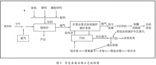 在有色金屬冶煉過程中,將原料、燃料和輔助材料根據(jù)熱平衡原理按一定比例進行配料,配料后的物料與空氣或高含氧的混合空氣在熔煉爐中進行氧化或還原反應,熔煉出有色金屬產(chǎn)品。同時,在熔煉過程中會產(chǎn)生大量的高溫煙氣( 1200 ℃ 左右),高溫煙氣經(jīng)過余熱鍋爐時,與余熱鍋爐水側(cè)的軟化水進行熱量交換,煙溫迅速降至 250℃ 以下,再經(jīng)收塵、制酸或脫硫裝置進一步收塵、降溫、凈化,*終達標排放。余熱鍋爐水側(cè)的軟化水經(jīng)熱量交換后產(chǎn)生中壓飽和蒸汽(4 MPa 左右),送至余熱發(fā)電機組發(fā)電。具體的工藝流程如圖 1 所示。