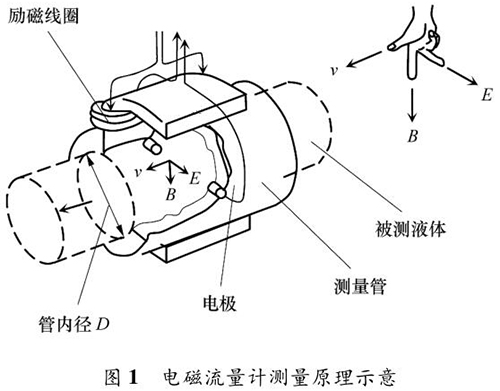 乙醇管道流量計的測量原理如圖 1 所示。根據(jù)法拉*電磁感應(yīng)定律,導(dǎo)電液體在磁場中流動會產(chǎn)生電動勢 E,它與磁感應(yīng)強(qiáng)度 B、導(dǎo)電液體平均流速 v 成一定比例關(guān)系: