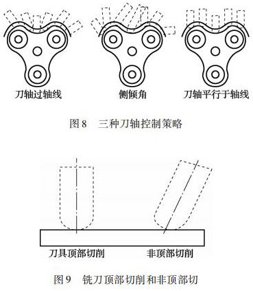 四軸加工中采用球頭銑刀,刀軸控制策略是提高加工效率和轉(zhuǎn)子曲面表面粗糙度的關(guān)鍵。如圖 8所示,刀軸控制策略有常見的刀軸過軸線、側(cè)傾角、刀軸平行于軸線。筆者采用平行軸線銑削加工方式對這 3 種刀軸控制策略進(jìn)行實(shí)際加工對比,得出采用側(cè)傾角刀軸控制策略加工出的轉(zhuǎn)子曲面表面粗糙度*好。其原因主要由于刀軸平行于軸線這種刀軸控制策略采用球頭銑刀加工時(shí),其刀具切削轉(zhuǎn)子曲面時(shí)的接觸點(diǎn)為刀具的頂部,球頭銑刀的頂部直徑為零,線速度也為零。此時(shí)刀具是在擠壓工件,刀具頂部也容易磨損。刀軸過軸線策略雖然刀具與轉(zhuǎn)子曲面的接觸點(diǎn)一直在變換,但是也有刀位點(diǎn)是采用刀具頂部去切削。側(cè)前傾角刀軸控制策略: 控制刀具與轉(zhuǎn)子曲面接觸點(diǎn)的位置,避免球頭銑刀頂部銑削轉(zhuǎn)子曲面,實(shí)現(xiàn)刀尖的點(diǎn)的偏離,提高刀具切削點(diǎn)的線速度。球頭銑刀頂部切削和非頂部切削如圖 9 所示。